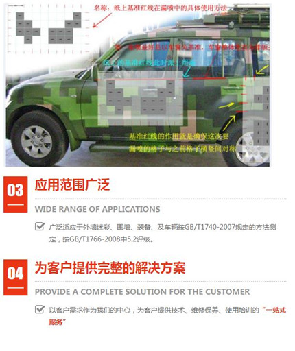 多年經(jīng)驗偽裝波段范圍:可見光(380nm~760nm)和近紅外(760nm~1200nm); 外墻迷彩漆不是水漆。盡管水漆是一種環(huán)保型的涂料,;